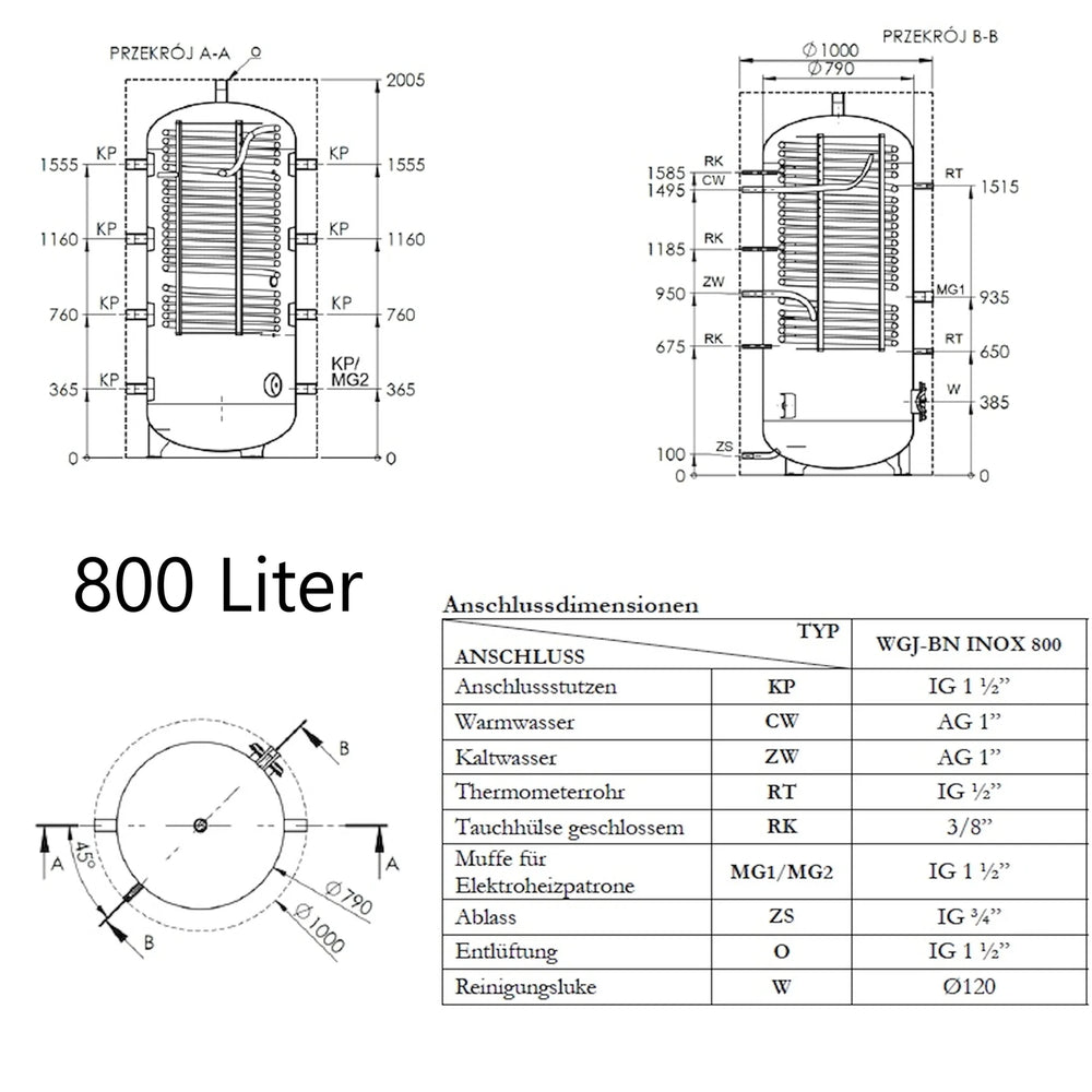 WGJ-BN INOX комбинира буферен резервоар за загряване на вода с вграден бойлер за битова гореща вода. Вътре гофрирана тръба от неръждаема стомана действа като топлообменник, осигурявайки голяма контактна повърхност за бърз и ефективен топлообмен и позволявайки моментално загряване на водата. Максималното работно налягане на резервоара е 0,3 MPa.
