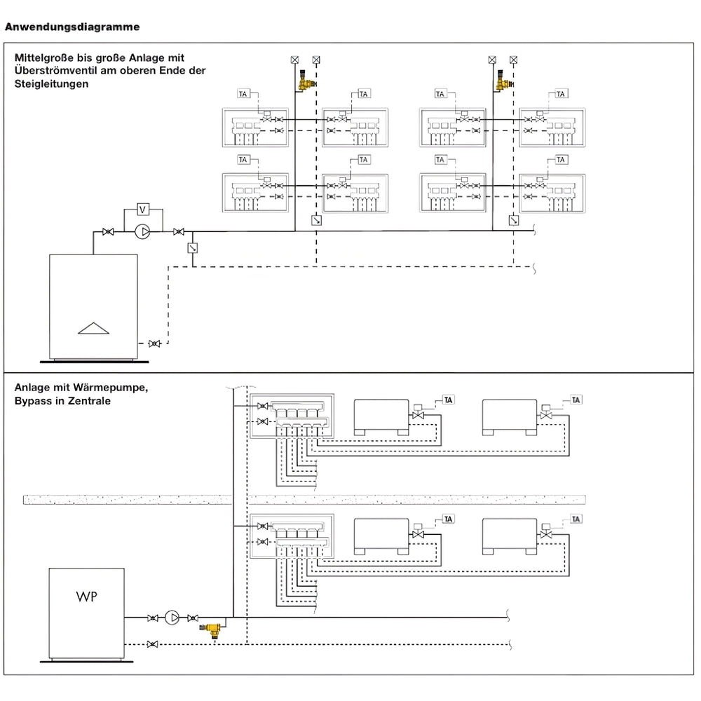 Vhodné pro systémy vytápění, chlazení a tepelná čerpadla s proměnným průtokem. Obzvláště užitečné v systémech s více spotřebiči, pohony nebo čerpadly s regulací otáček pro zajištění minimálního průtoku a omezení tlaku.