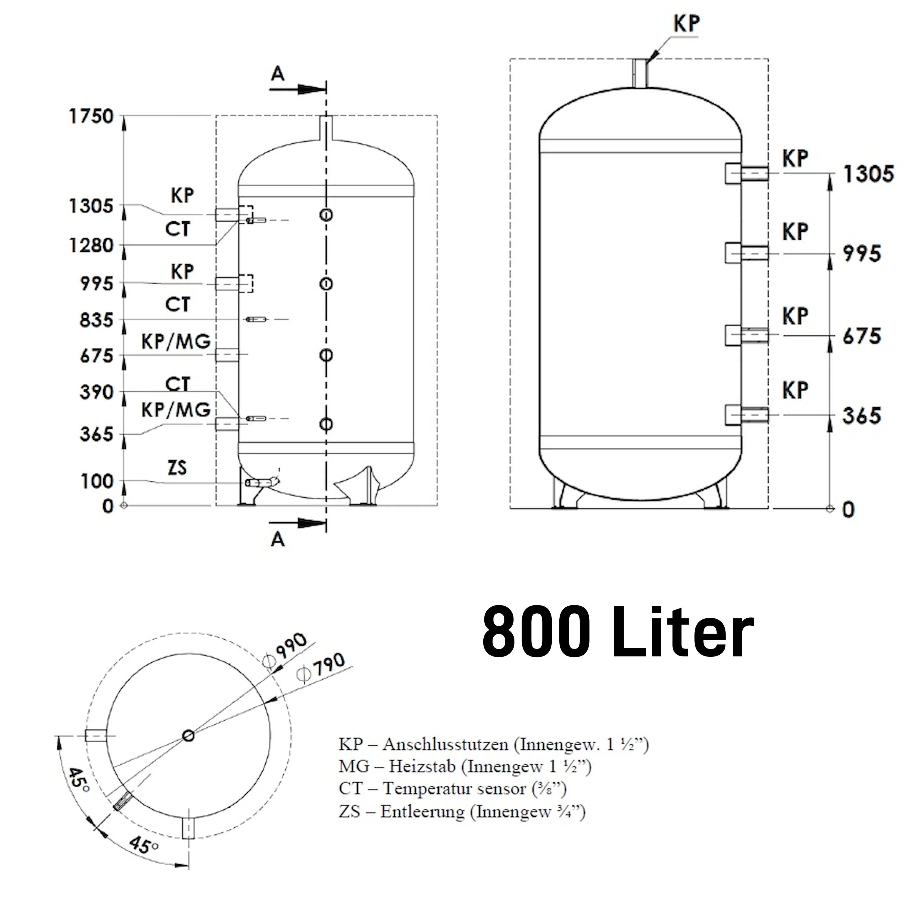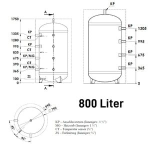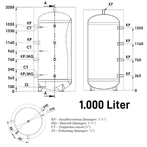 Διαστάσεις σύνδεσης: Σύνδεση εξαρτήματος (KP) εσωτερικό σπείρωμα 1½", σύνδεση θερμαντικού στοιχείου (MG) εσωτερικό σπείρωμα 1½", σύνδεση αισθητήρα θερμοκρασίας (CT) 3/8", Εσωτερικό σπείρωμα αποστράγγισης (ZS) 3/4".