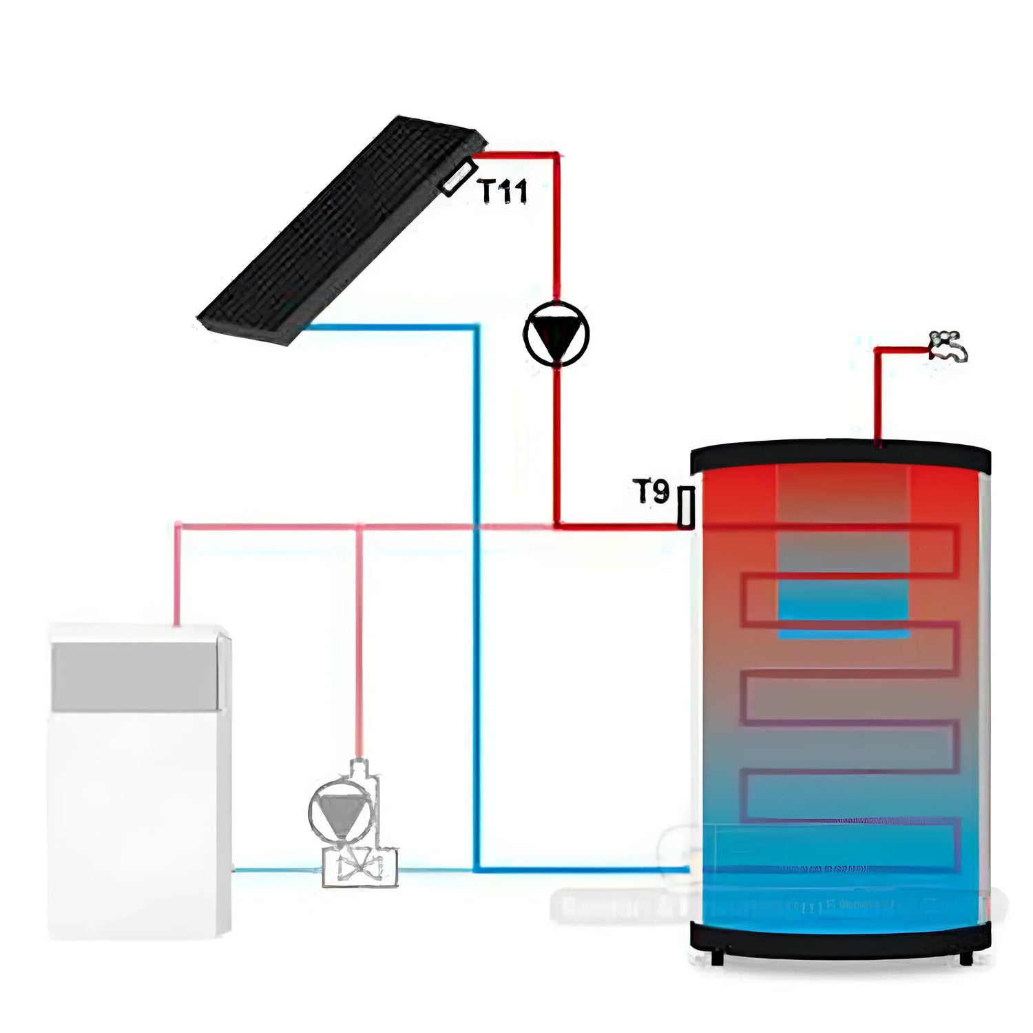 The temperature differential controller is a true all-rounder: It can not only control a charging pump, but also be used for return flow boosters (such as Laddomat or ESBE systems), fans, or solenoid valves. Furthermore, the device can be used as a thermostat, offering maximum flexibility and a wide range of application possibilities.