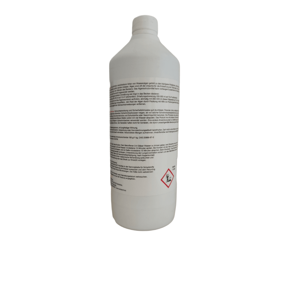 Our 1L algae control product is designed to permanently maintain the water quality in your pool. It effectively combats various types of algae and prevents unsightly and annoying algae from multiplying uncontrollably. While maintaining an uninterrupted swimming experience, your pool remains a pleasant one.