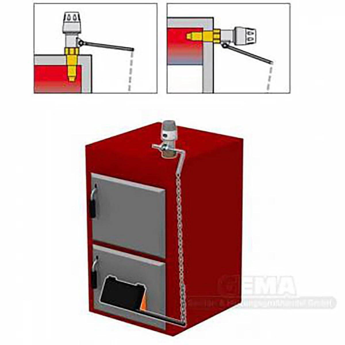 Teplota v tepelném generátoru je měřena integrovaným termostatem. Termostat je připojen ke klapce přiváděného vzduchu pomocí páky a řetízku. V závislosti na teplotě výstupní vody z kotle je přívod vzduchu regulován otevíráním nebo zavíráním klapky přiváděného vzduchu. Pro teplotně závislé nastavení klapky přiváděného vzduchu u kotlů na tuhá paliva a kotlů s proměnným spalováním.