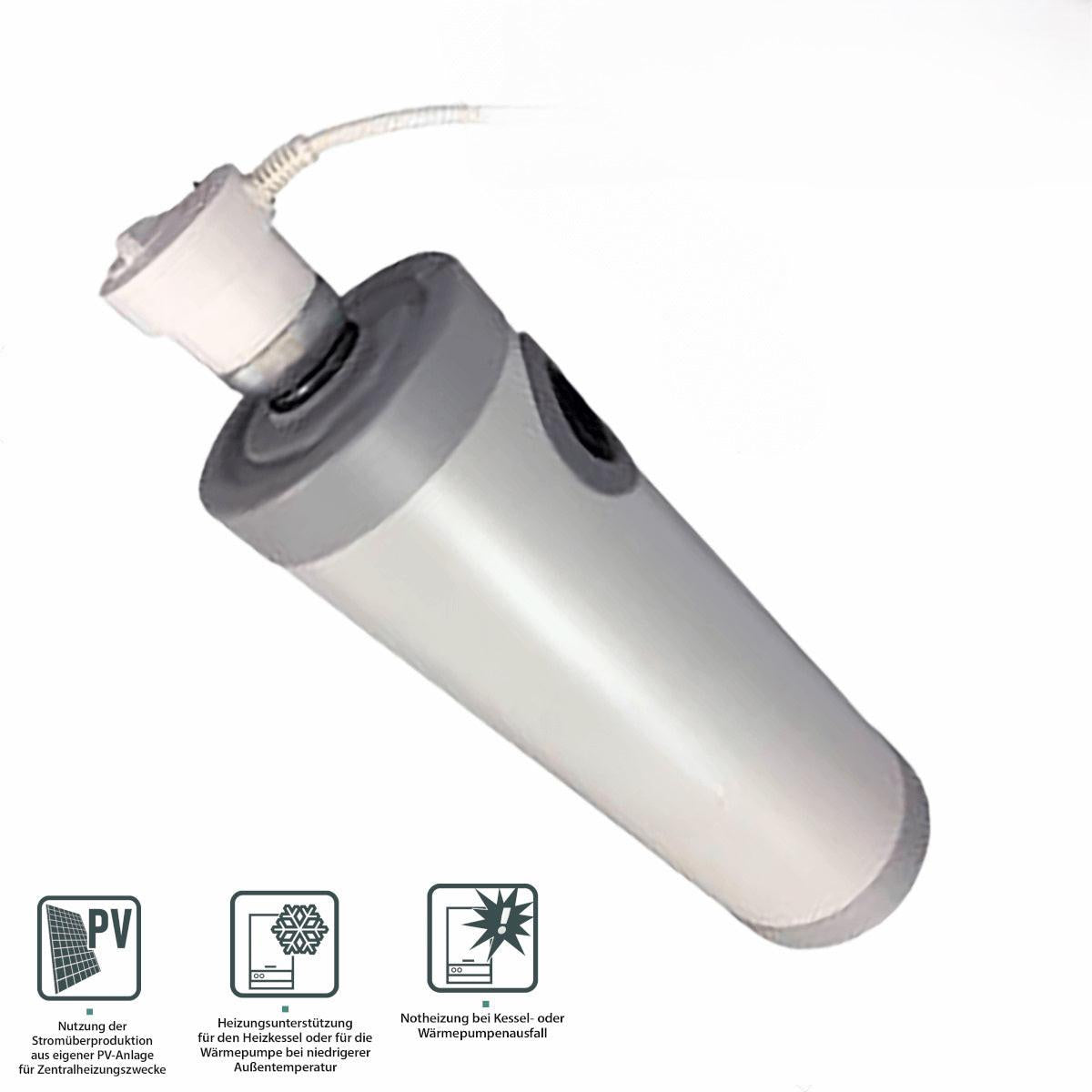 A integração simples do cartucho de aquecimento em tanques de armazenamento existentes é possível graças ao 1 1/2" Conexão com rosca externa e comprimento de instalação compacto de 520 mm são suportados. Um cabo de conexão de 1,5 metro de comprimento também permite uma alimentação elétrica descomplicada.