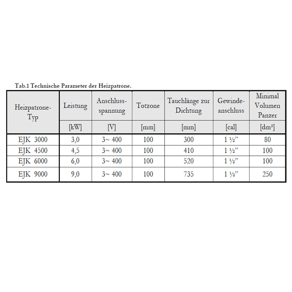 O cartucho de aquecimento do pacote completo está disponível em diferentes classes de potência, projetado especificamente para 1,5 kW, 2,0 kW, 3,0 kW a 230 V e 4,5 kW, 6,0 kW e 9,0 kW a 400 V. Essas variantes permitem uma adaptação ideal às necessidades energéticas individuais do sistema de aquecimento.