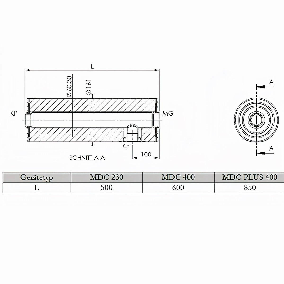 • Dimensões MDC400 (diâmetro x comprimento): 161 mm x 600 mm